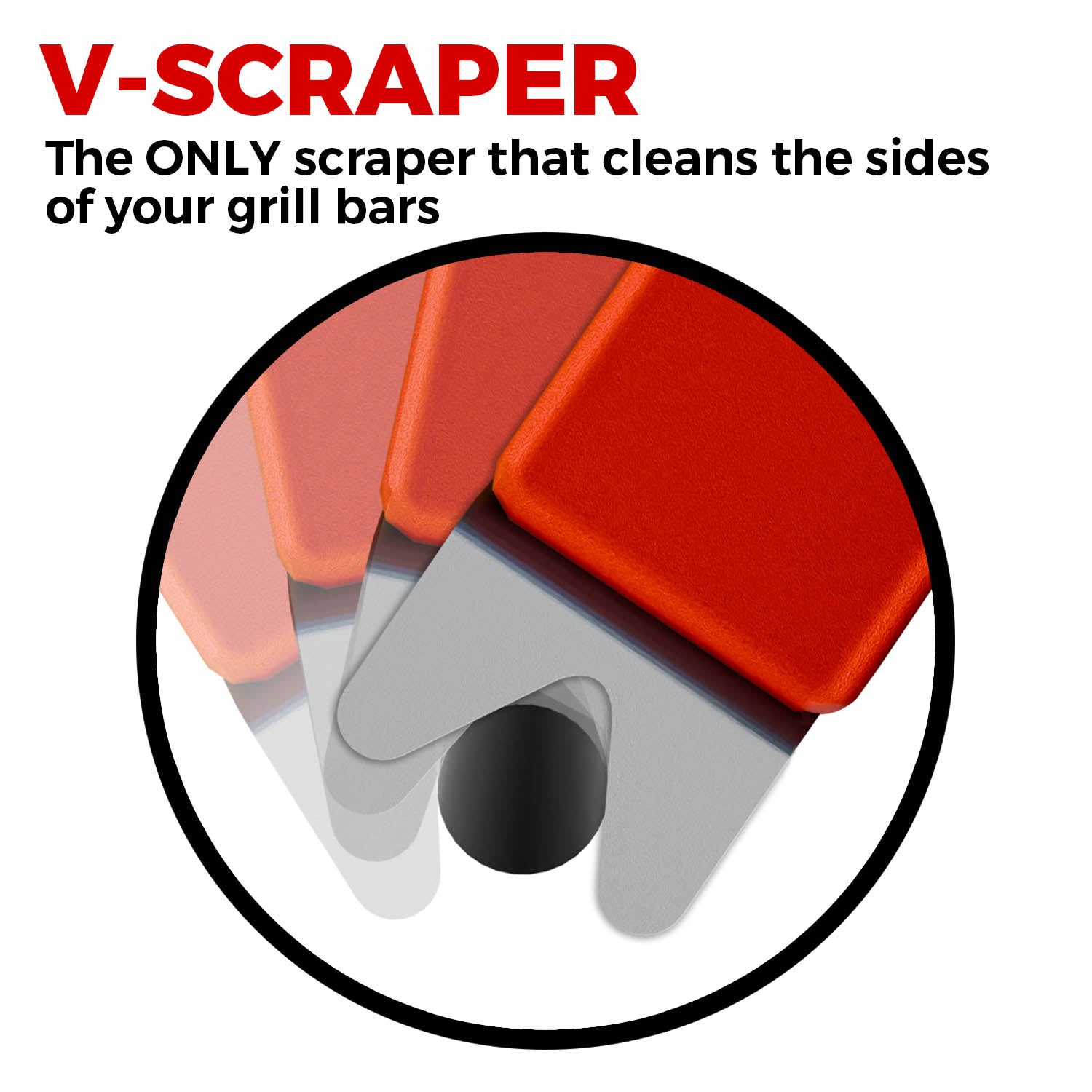 - V-SCRAPER. A patent-pending Grill Stripper first, our unique V-Scraper cleans where other BBQ scrapers can’t - the SIDES of your grill grates! Traditional grill scrapers for outdoor grills are great at cleaning the tops of grill bars, which is why Grill Stripper has one - it works! But our V-Scraper takes clean to a whole new level with a dedicated 900 side-scraper that adapts to grates of any shape or size. Adios carbon gunk!