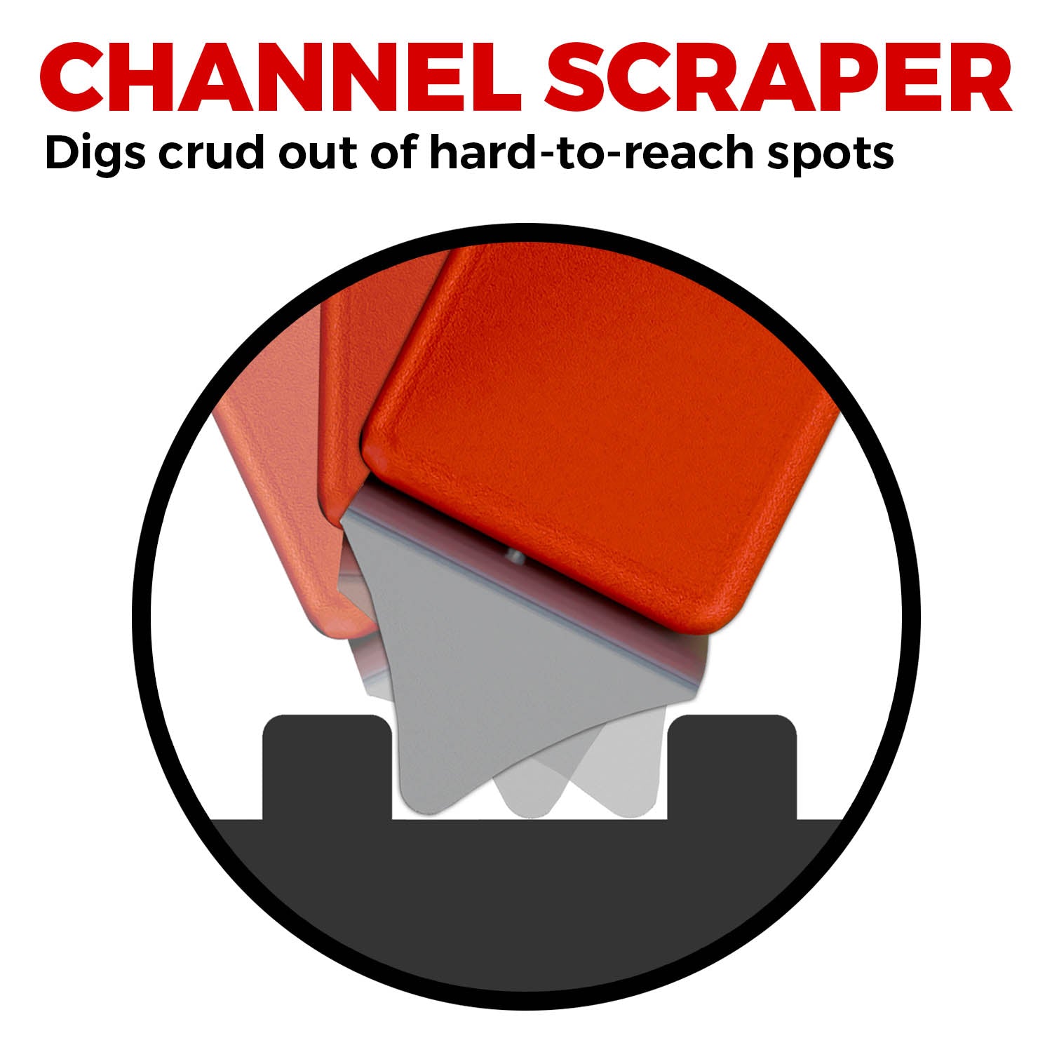 - CHANNEL-SCRAPER. Ever wish you had something to poke out those hard-to-reach carbon buildups? Yeah, us too, which is why we created it! Perfect for cast-iron grates with grooves & channels that trap BBQ gunk, our Channel-Scraper gets into those places where the sun doesn’t usually shine! Perfect for OCD types who want to eat tonight’s steak without tasting last night’s fish! That’s right, another Grill Stripper first, patent-pending of course!